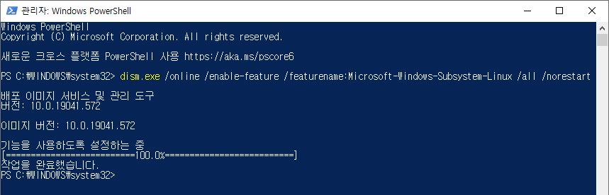 더보기dism.exe /online /enable-feature /featurename:Microsoft-Windows-Subsystem-Linux /all /norestart