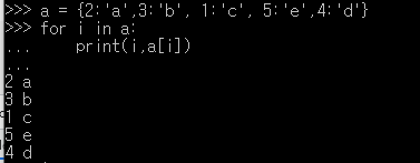 a = {'a':1, 'b':2, 'c':3, 'd':4} for i in d: print(a[i])위와같이 for문을 사용해 순서대로 꺼낼 수 있다는 뜻이다.